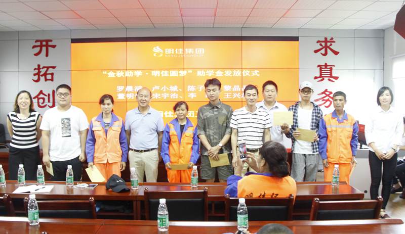 8月28日上午,明佳集團(tuán)工會(huì)“金秋助學(xué)·明佳圓夢(mèng)”助學(xué)金發(fā)放儀式在集團(tuán)公司三樓會(huì)議室舉行,為8個(gè)考取大學(xué)的職工子女發(fā)放助學(xué)金共計(jì)9600元。總裁陳云、副總經(jīng)理鐘寒參加發(fā)放儀式,儀式由工會(huì)主席高斐斐主持。